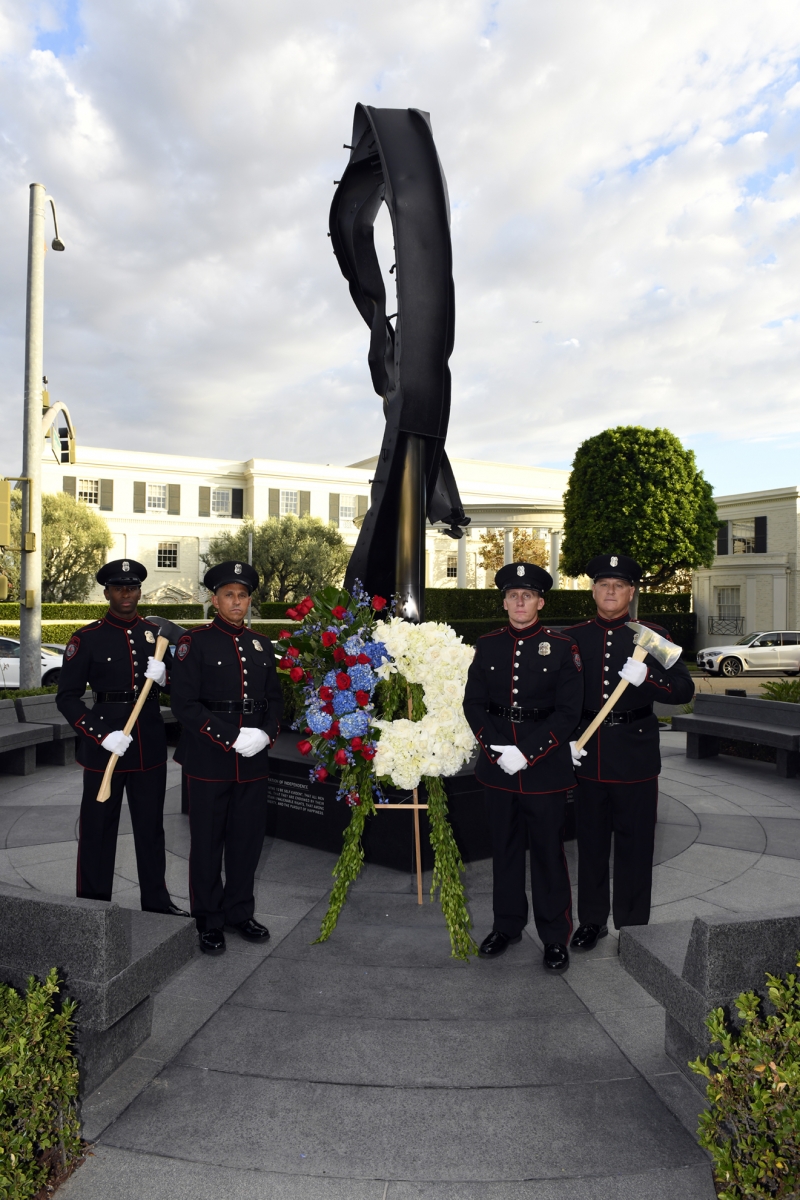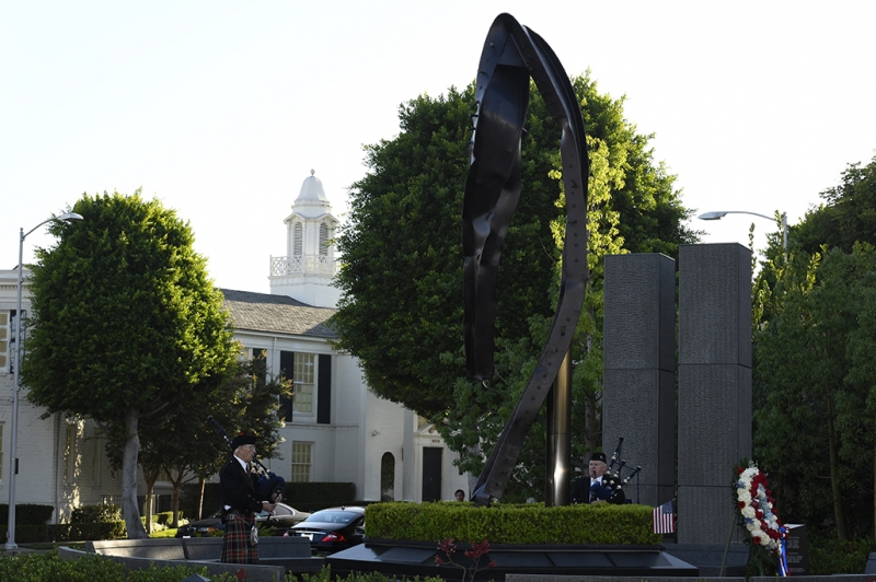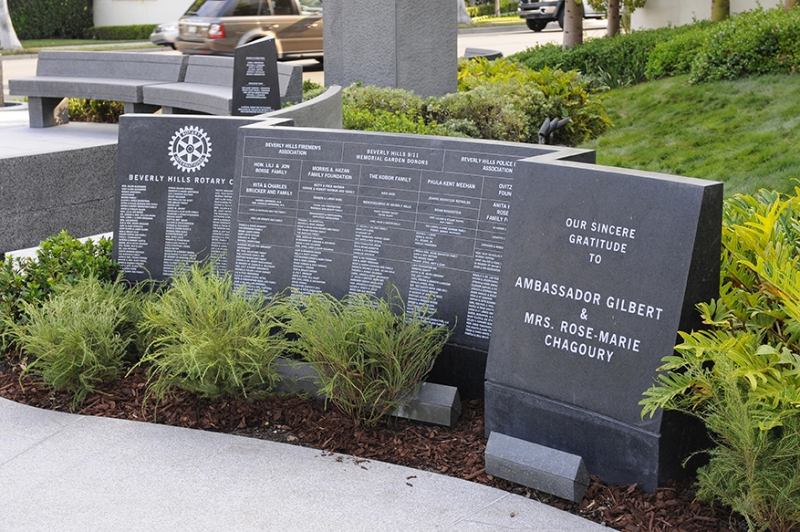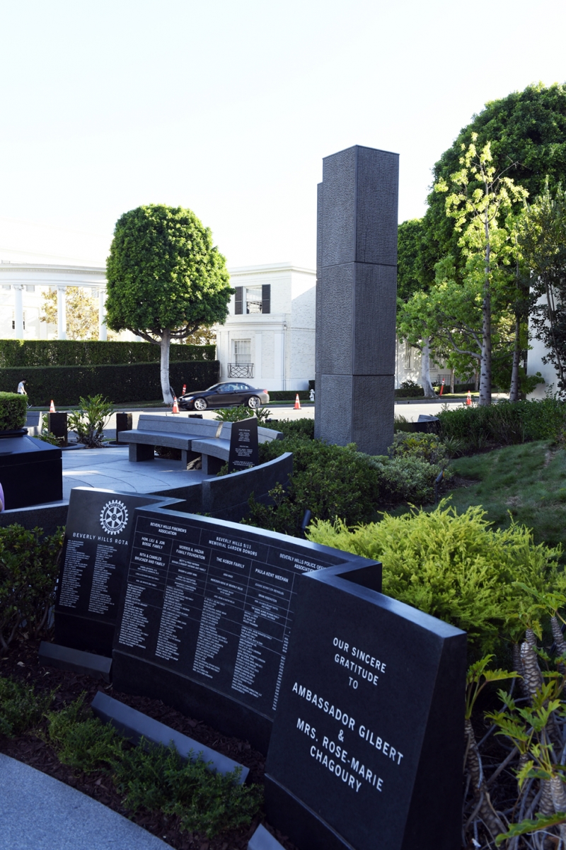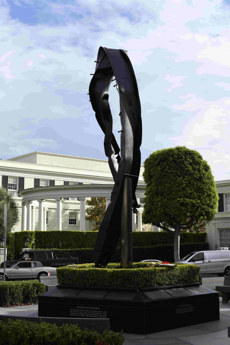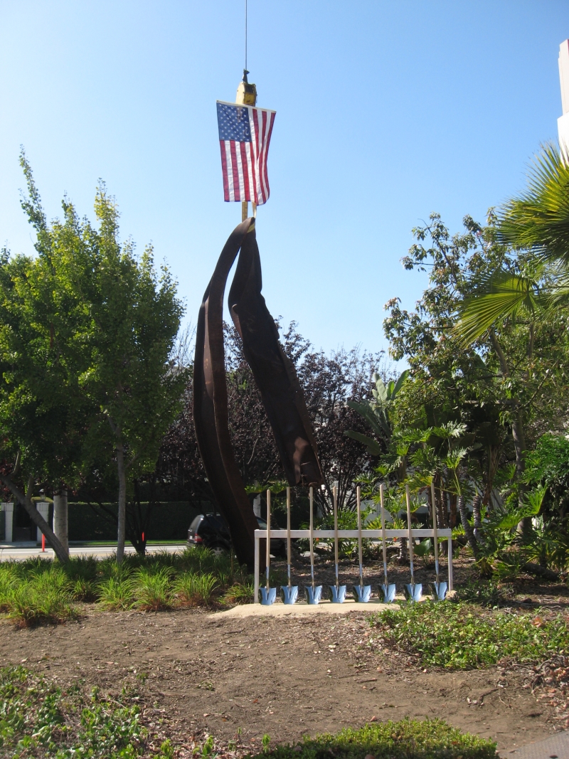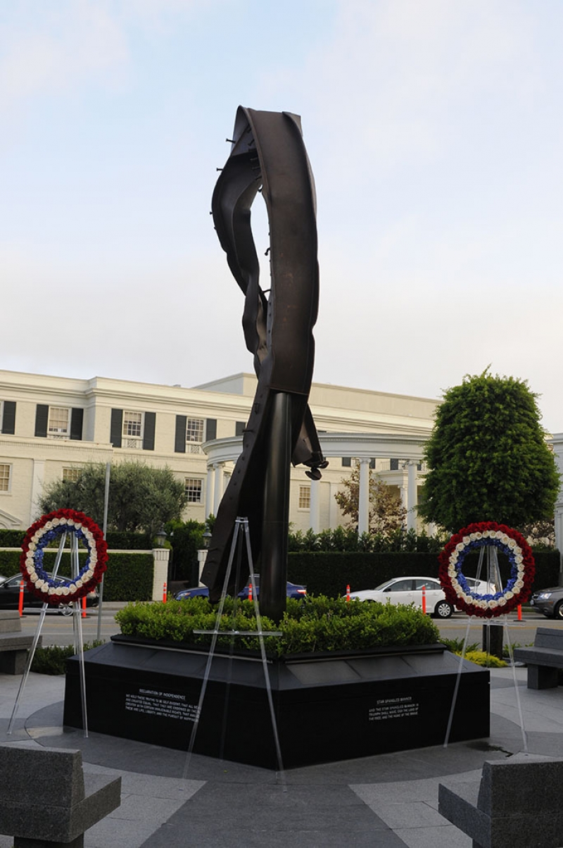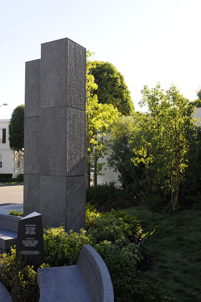 The Beverly Hills 9/11 Memorial Garden provides a sanctuary for those who wish to honor, sit and reflect, contemplate and remember the events of that day. In addition to the imposing Twin Towers floor beam erected at the center of the site, various vignettes have been incorporated to represent the locations of the three plane crash sites – the World Trade Center, the Pentagon and the field in Shanksville, Pennsylvania.